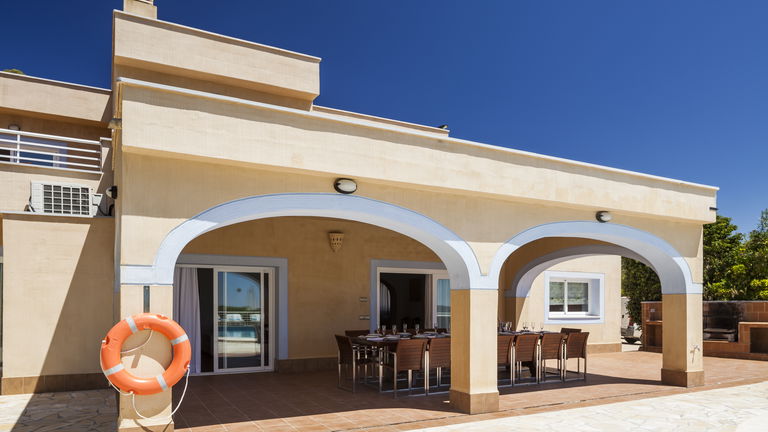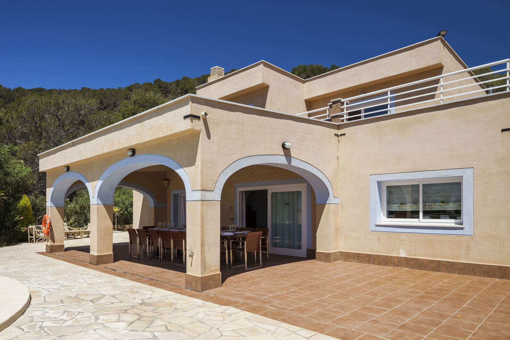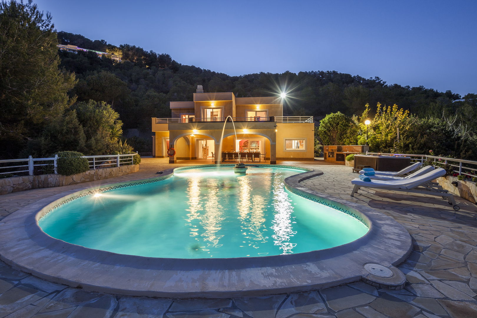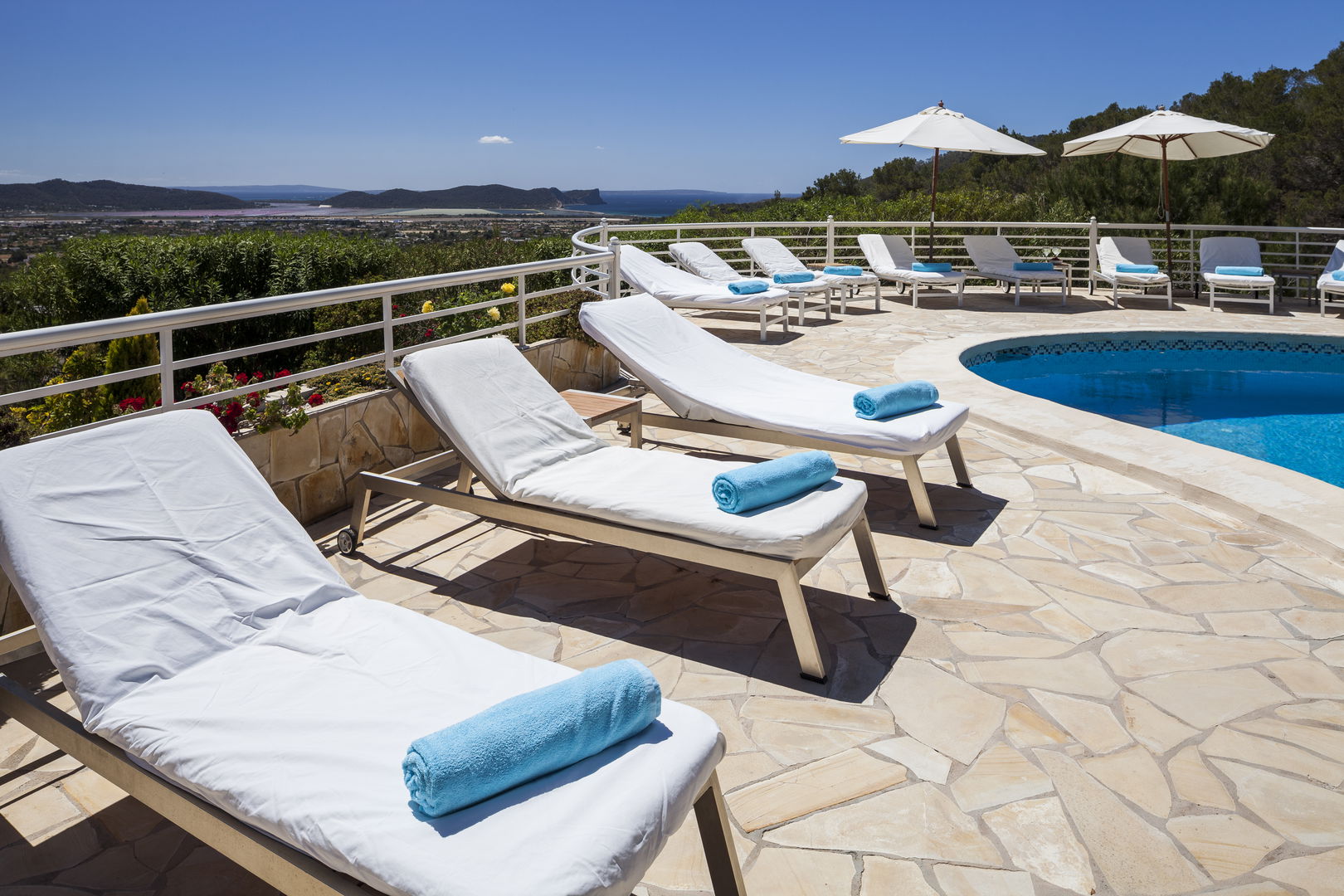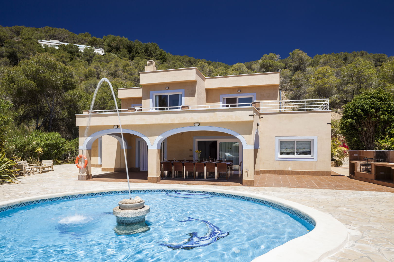 Elegante villa de estilo mediterráneo ubicada en lo alto de una colina, en el exclusivo km4 al sur de Ibiza. Ubicación privilegiada: vistas panorámicas a Las Salinas y Formentera, a solo 10 minutos de Ibiza ciudad, Playa d'en Bossa y el aeropuerto. Características: 6 habitaciones dobles con baño en suite, Piscina privada de agua salada con vistas al mar, Zona chill-out, tumbonas, barbacoa y porche con comedor al aire libre.Para los más activos, la villa ofrece esterillas de yoga, pesas, mancuernas, billar, mesa de ping-pong y una selección de juegos de mesa, ideales para mantener cuerpo y mente en perfecta armonía. Servicio de limpieza incluido: 1 limpieza para estancias superiores a 5 noches con cambio de toallas; para más de 10 noches, limpieza adicional cambio de sábanas. Horario de limpieza: 10:30 a 13:00 h, excepto domingos. Espacios amplios y luminosos, ideales para familias, grupos de amigos o retiros corporativos que buscan confort, privacidad y un entorno natural impresionante.